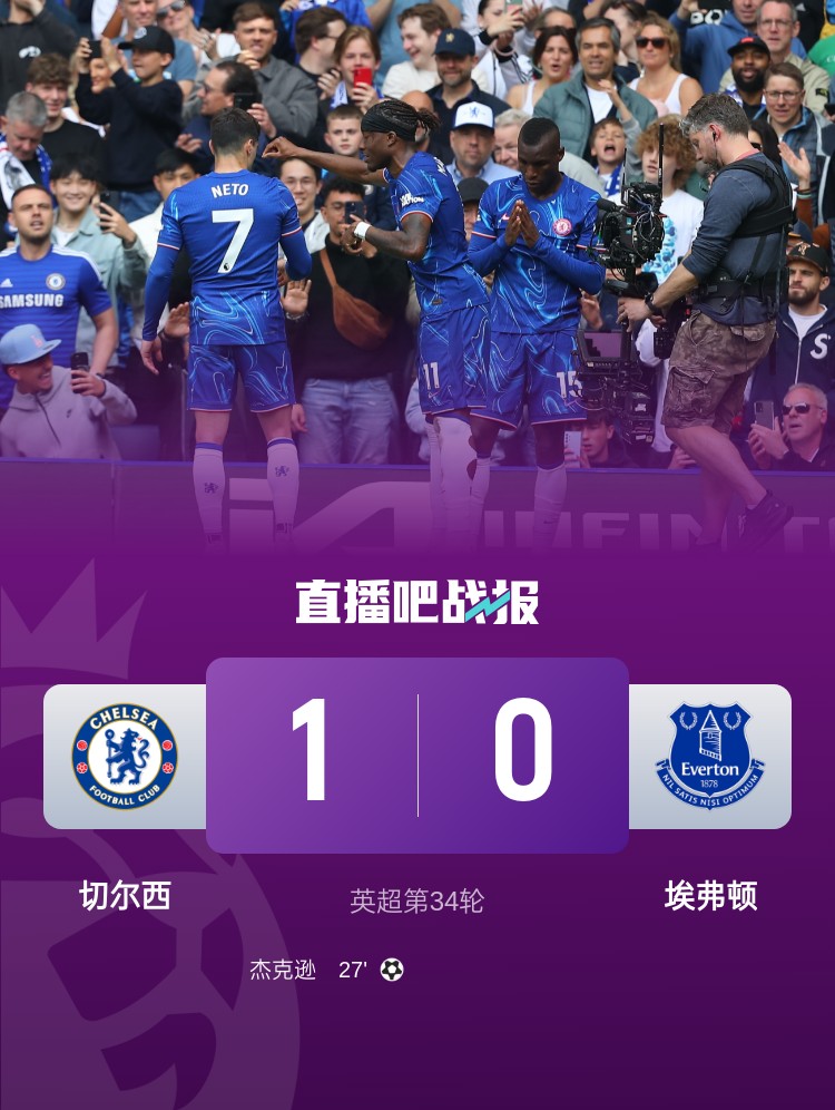 4月26日讯 北京时间4月26日19:30,英超联赛第34轮切尔西迎战埃弗顿的比赛在斯坦福桥球场进行,上半场皮克福德献精彩扑救,恩佐助攻杰克逊远射破门破13场球荒,埃弗顿0射正,半场结束,切尔西1-0埃弗顿。下半场桑切斯献神扑,最终切尔西1-0埃弗顿先赛升第4。